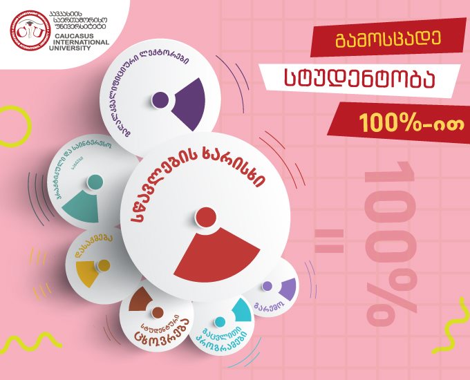 რისგან შედგება თქვენთვის სტუდენტობა? რა კომპონენტებისგან უნდა შედგებოდეს ეს პროცესი, რომ თამამად ვთქვათ - სტუდენტობა 100%-ით? პასუხი მარტივია: მრავალფეროვანიდა აქტიური სტუდენტური ცხოვრება; საერთაშორისო სტანდარტებზე მორგებული პროგრამები; გაცვლითი პროგრამები დაფინანსებით ევროპის წამყვან უნივერსიტეტებში; წარმატებული და მაღალკვალიფიციური ლექტორები; პრაქტიკაზე დაფუძნებული სწავლება; დასაქმება სწავლის პარალელურად; გადახდის მოქნილი სისტემა; სტიპენდიები და გრანტები - ამიტომაც აირჩიე კავკასიის საერთაშორისო უნივერსიტეტი (115) და გამოსცადე შენი 100%-იანი სტუდენტობა!