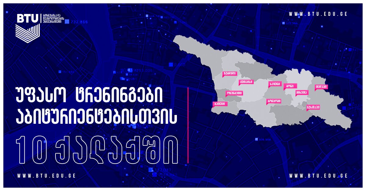 ბიზნესისა და ტექნოლოგიების უნივერსიტეტის სტრატეგიაა, რომ მათ პროექტებსა და ტრენინგებში ჩართვა ქვეყნის მასშტაბით რეგიონების წარმომადგენლებმაც შეძლონ. სწორედ ამიტომ ტრენინგების სერია საქართველოს 10 ქალაქში გაიმართება. აბიტურიენტებთან შეხვედრები 30 მარტიდან აიღებს სტარტს და შემდეგი განრიგით გაგრძელდება: