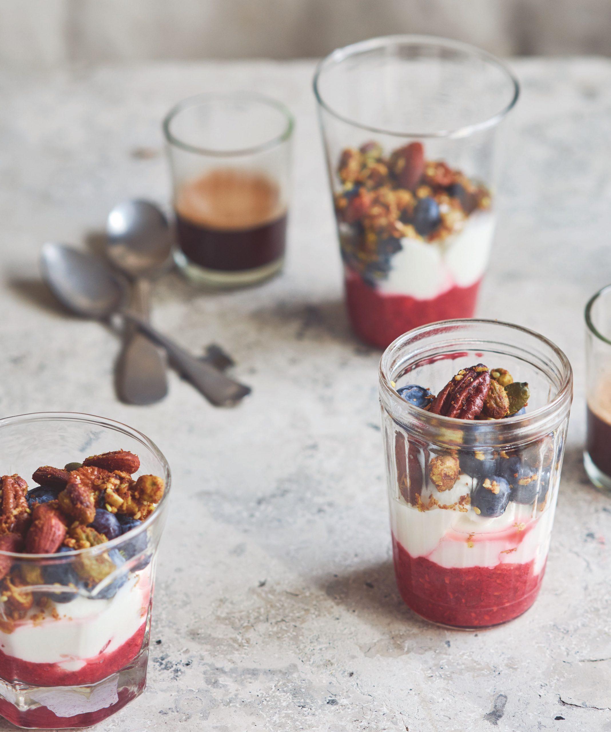 იოგურტი შესანიშნავი, მარტივი საუზმის ვარიანტია, რომლის მომზადებას დიდი დრო არ სჭირდება. სცადეთ ტრადიციული თაფლის ან სიროფის ნაცვლად, ნატურალურ იოგურტს დაუმატოთ ჯემი. ეს მისცემს თქვენს კერძს მდიდარ გემოსა და არომატს, ასევე დამატებით სიტკბოს. დაასრულეთ საუზმე ხრაშუნა გრანოლით ტექსტურული კონტრასტისთვის.