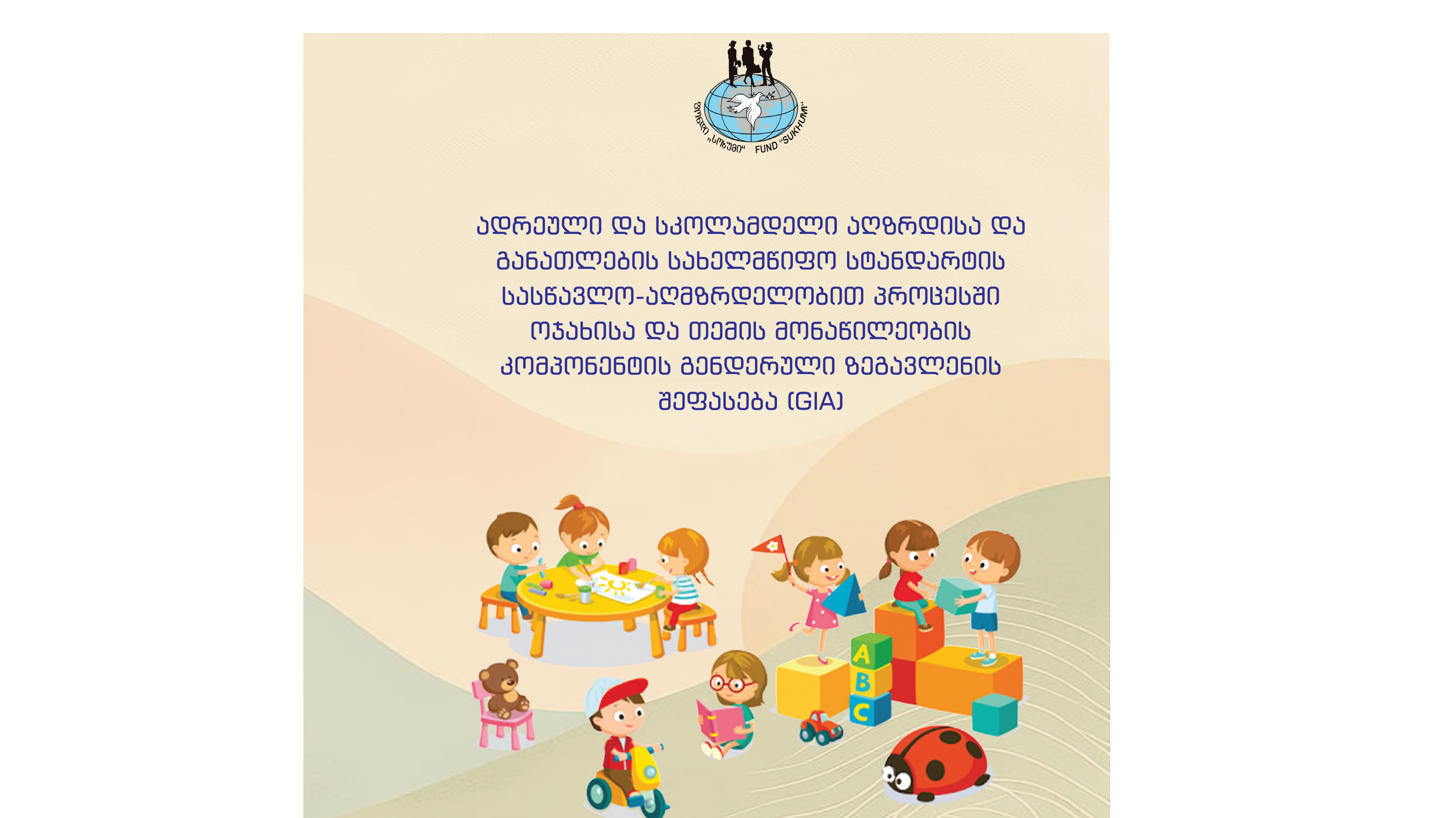 ქალთა ფონდი „სოხუმის“ მიერ გენდერული ზეგავლენის შეფასების ინსტრუმენტის (GIA) გამოყენებით განხორციელდა საინტერესო კვლევა, რომელიც მიზნად ისახავს სკოლამდელი აღზრდისა და განათლების სახელმწიფო სტანდარტის „ოჯახისა და თემის მონაწილეობის“ კომპონენტის სხვადასხვა სამიზნე ჯგუფზე ზეგავლენის შესწავლას. კვლევის პირველად სამიზნე ჯგუფს წარმოადგენდნენ აღსაზრდელები, მაგრამ გამოვლინდა სტანდარტის მოცემული კომპონენტის განსხვავებული ზეგავლენა დედებსა და მამებზე, მშობლების სხვადასხვა კატეგორიაზე (დასაქმებული, მიგრანტი, სსმ და შშმ ბავშვების მშობლები), ასევე სკოლამდელი აღზრდისა და დაწესებულებების პერსონალზე, თემის სხვადასხვა ჯგუფზე, მათ შორის სერვის-პროვაიდერებზე.