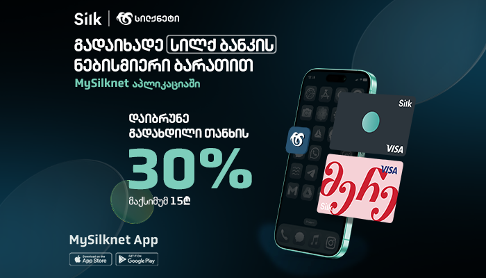 ერთი თვის განმავლობაში, MySilknet აპლიკაციაში სილქ ბანკის ნებისმიერი ბარათით პაკეტის შეძენისას ან თანხის დაფარვისას, მომხმარებელს გადახდილი თანხის 30% ქულების სახით დაუბრუნდება (მაქსიმუმ 15 ლარი).