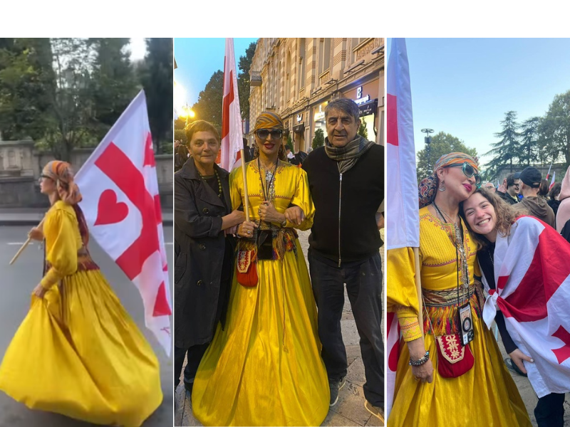 სუხიშვილების მოცეკვავე და ქორეოგრაფი, ოთხი შვილის დედა და უკვე ერთი შვილიშვილის ბებიაც, თეა დარჩია, შთმბეჭდავად გამოჩნდა აქციაზე რუსთაველზე. "ასე ეროვნულ კოსტიუმში გამოწყობილი წავედი 4 ოქტომბერს, ქართველების პირველ ეროვნულ კრებაზე", - წერს თეა.