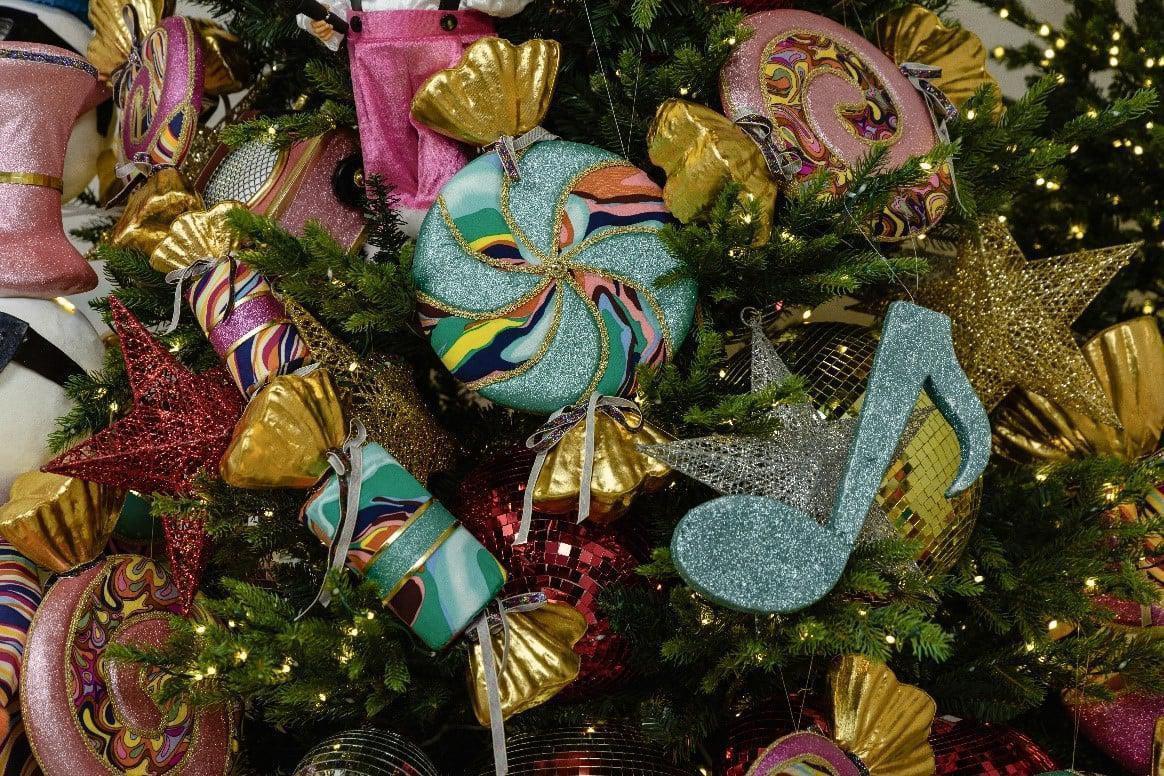 სფეროები, გრძელი წვეტიანი დეტალები, თხელი რგოლები და ოვალური ორნამენტები მონოქრომულ ხეს სიმეტრიასა და დინამიკას მატებენ. ფორმების მრავალფეროვნება ფერთა ერთიანობას არ არღვევს, პირიქით მას უფრო დახვეწილს ხდის.