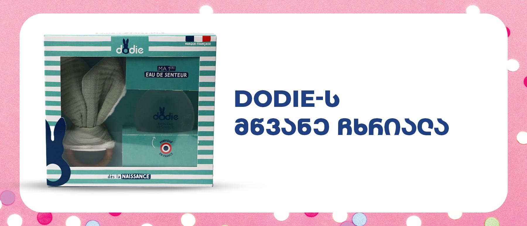 უმაღლესი ხარისხის ფრანგული ბრენდის, Dodie-ს ნაკრები მოიცავს სურნელოვან წყალს, რომელიც სპეციალურად ბავშვებისთვის არის შექმნილი და არ შეიცავს მავნე ნივთიერებებს, არის უსაფრთხო და ჰიპოალერგიული ბავშვის კანისთვის; სათამაშოს, რომელიც შექმნილია ბავშვის მოტორული უნარების და წარმოსახვის განვითარებას. ამასთან, გამოიყენება ღრძილების ქავილისას.
