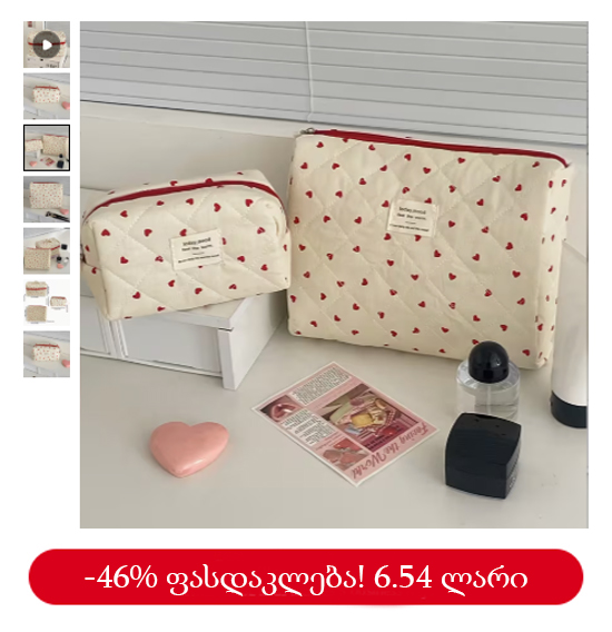 გულებით გაფორმებული კოსმეტიკის ჩანთა იდეალური საჩუქარია მათთვის, ვინც აფასებს სტილისა და პრაქტიკულობის სინთეზს. მისი ტევადი და მრავალფუნქციური დიზაინი საშუალებას იძლევა, ნივთი ერთნაირად ეფექტურად იქცეს როგორც მაკიაჟის ჩანთად, ისე საკანცელარიო ორგანაიზერად ან სამგზავრო ჰიგიენური ნივთების სათავსოდ.