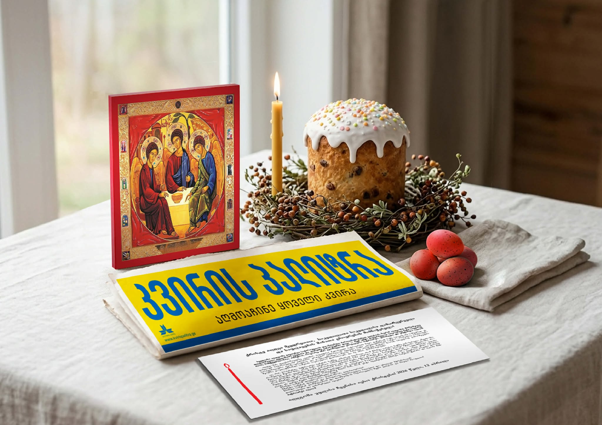 „კვირის პალიტრის“ 13 აპრილის ნომერს „ყოვლადწმინდა სამების“ ხატი და წმინდა ცეცხლით თავმომწვარი სანთელი მოყვება კონვერტით, რომლის გახსნაც ყველა მართლმადიდებლისთვის მართლაც რომ ემოციური იქნება.