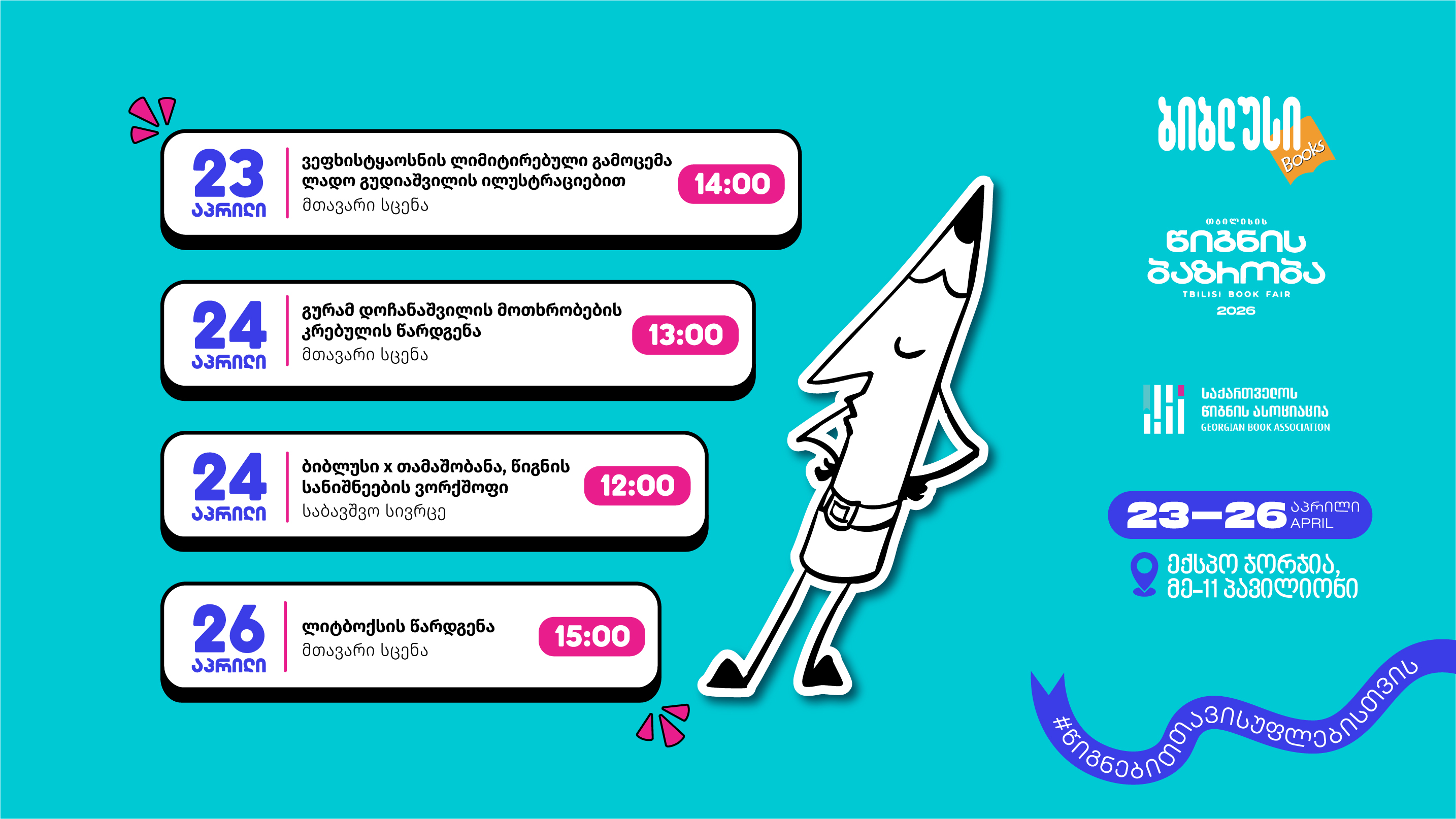 წიგნს ბაზრობა გიმასპინძლებთ „ექსპო ჯორჯიაში“, სადაც „ბიბლუსი“ წიგნებისა და აქსესუარების მრავალფეროვანი ასორტიმენტით იქნება წარმოდგენილი და ოთხი დღის განმავლობაში შემდეგ აქტივობებს შემოგთავაზებთ: